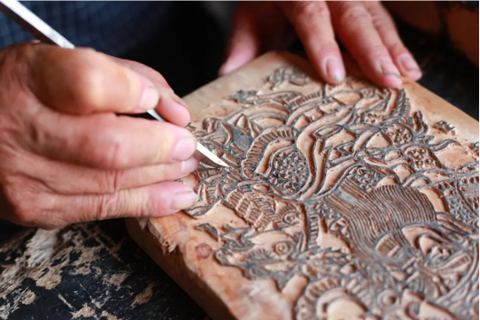 第一步选用上等坚实的梨木进行刻版,刻前先用植物油涂于木板表面三到四遍,自然凉干后,再用顶沸的热水冲洗。然后用特制刮刀刮去木板表面浮油,艺人称之为“熟版”。木板雕刻工具早年多为自行制作,有刻刀、净缝刀、文章锉、巩锉、刮刀、铲刀、敲锤等二十余件。后来,雕版师傅也在使用成套的专用雕刻刀。