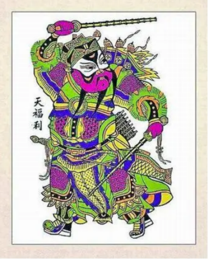 朱仙镇木版年画刀技线条粗犷豪放,阴粗阳细,阴阳对比性较强。尤其是在神像画的衣纹上表现更为突出,有乡土气息,具有北方民族的纯朴、厚实、健壮、整洁的艺术风格。