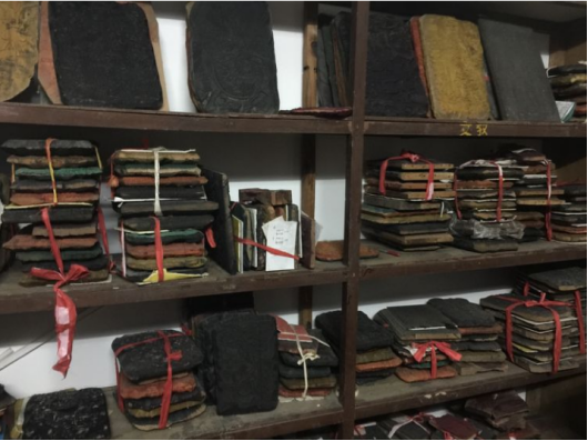 年画200张为一“块”。印时将纸张按不同的张数按“块”夹在自制竹夹上。纸夹牢后,一头插入 “管钉”,一头置于自制灰砖槽中,纸折叠呈“S”状。