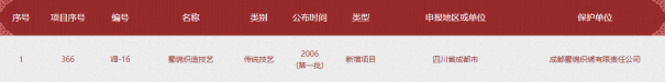 2006年5月20日,蜀锦织造技艺经国务院批准列入第一批国家级非物质文化遗产名录。项目编号Ⅷ-16。