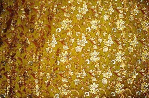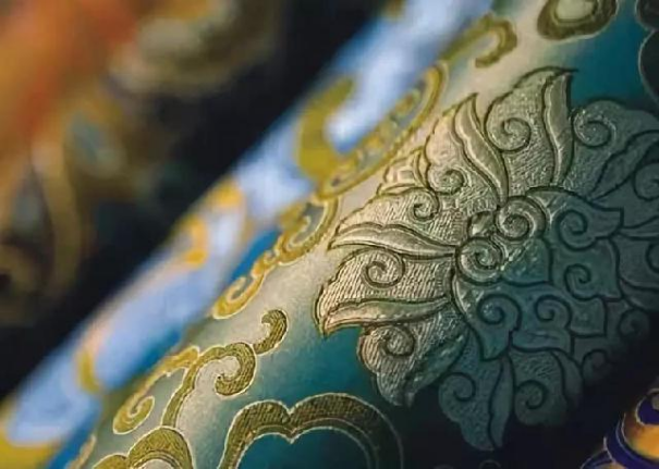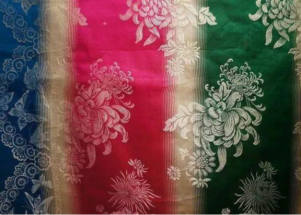 民族锦一般采用多色彩条嵌入金银丝织成,多用于民族服饰,故名。其特点是锦面上的图案从经纬线交织中显现出自然光彩,富有光泽。常见的图案有团花、葵花、“万”字“e”“寿”字等。彩晕锦的特点是织纹华贵相映,明暗匹配,层次分明,并以色晕过渡,花纹绚丽多彩,别具一格。